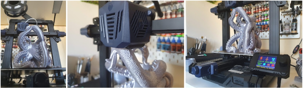 Utilizando el excelente filamento de Anycubic PLA Silk plata que además nos sirve para resaltar cualquier artefacto nos dedicimos a imprimir diferentes impresiones de test propias en ambas impresoras, y por descontado que no fueron piezas sencillas ya que queriamos ver el potencial de estas máquinas.