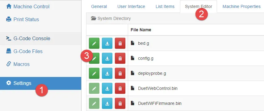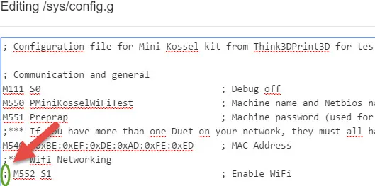 Configuraremos que nuestro módulo WiFi se active automáticamente en el inicio, para ello y desde el interfaz web modificaremos el fichero de configuración config.g y buscaremos la linea ;M552 S1 y quitaremos el ; del inicio y guardaremos los cambios en el botón Save Changes y los aplicaremos en el botón Apply Settings.