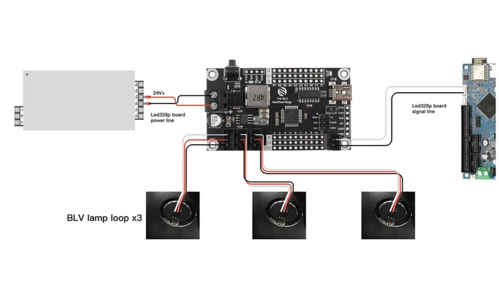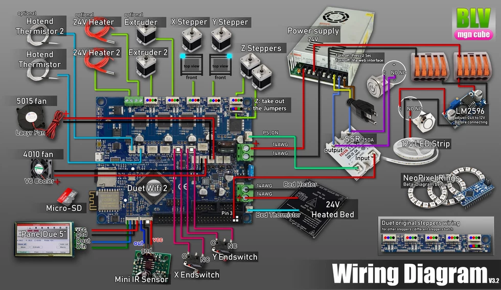 Además de la inclusión de los anillos Neopixel el kit incluye 4 tiras de leds blancos de 24v para usar como iluminación de la zona de impresión. Dentro de los STL de Fysetc como BLV podréis incluir los difusores para su instalación así como el esquema de conexión de estos con uno de los interruptores incluidos.