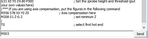 Para verificar que tenemos conexión con nuestra Duet lanzaremos el comando gcode M503 que nos devolverá los parámetros de configuración de nuestra impresora (config.g)