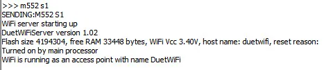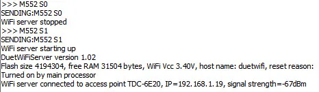 Sin desconectar el cable USB ni Pronterface enviaremos el comando M552 S0 para apagar el módulo WiFi y seguidamente M552 S1 para habilitarlo de nuevo. Al cabo de unos segundos veremos como en nuestro terminal nos indicará, si todo fué bien, que se ha conectado a nuestra WiFi y la IP de acceso