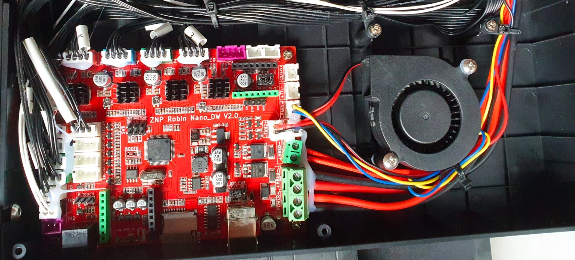 Tal como hemos comentado disponemos drivers TMC2225 en XYZ y TMC2209 en E que proporcionan un funcionamiento suave, preciso y silencioso. También, aunque genera un poco de ruido, la inclusión de un ventilador dedicado principalmente a los drivers nos asegurará que estos trabajan en su punto óptimo.