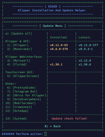 D**isponemos de** [**Kiauh**](https://github.com/dw-0/kiauh) **preinstalado que podremos lanzar ejecutando `./kiauh/kiauh.sh`**, probablemente nos solicite actualizarlo: