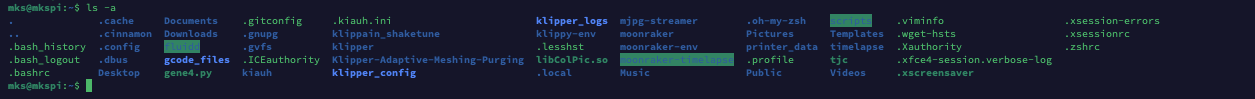 <figure><img src="https://3760761605-files.gitbook.io/~/files/v0/b/gitbook-x-prod.appspot.com/o/spaces%2F4SOiUz9PiuHFIwg2qk03%2Fuploads%2FdhhG0zsFrdO1nC2haGBn%2Fimage.png?alt=media&#x26;token=16ba5048-7f69-41fd-8cf3-cb44aca75601" alt=""><figcaption><p>contenido /home/mks donde se encuentra la instalación de Klipper y el resto de componentes</p></figcaption></figure>