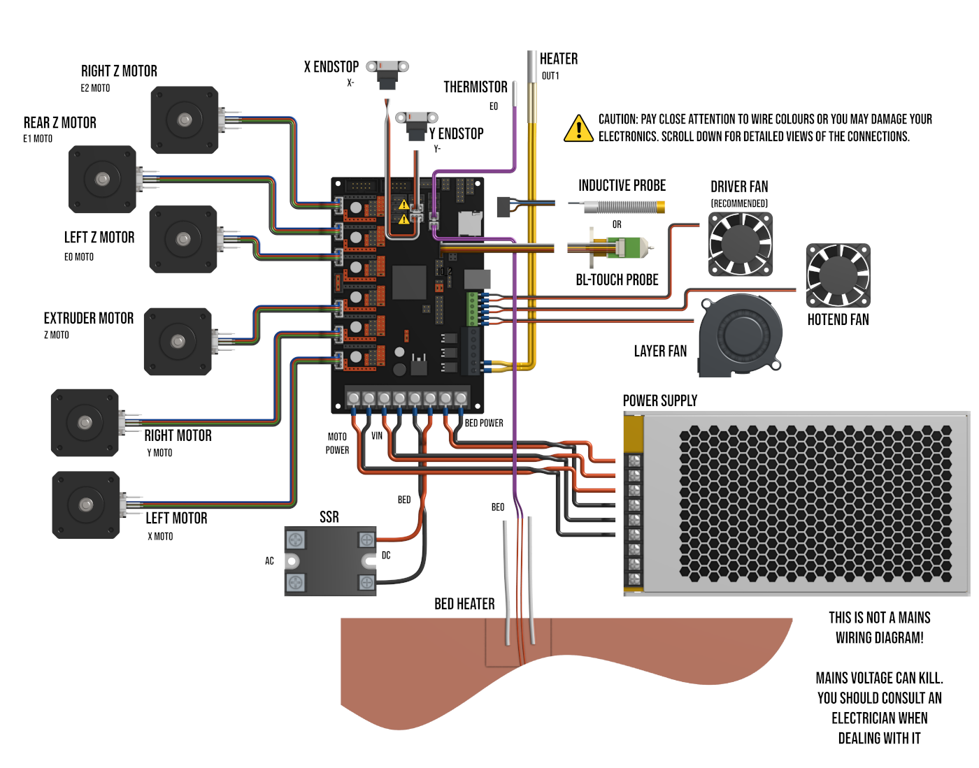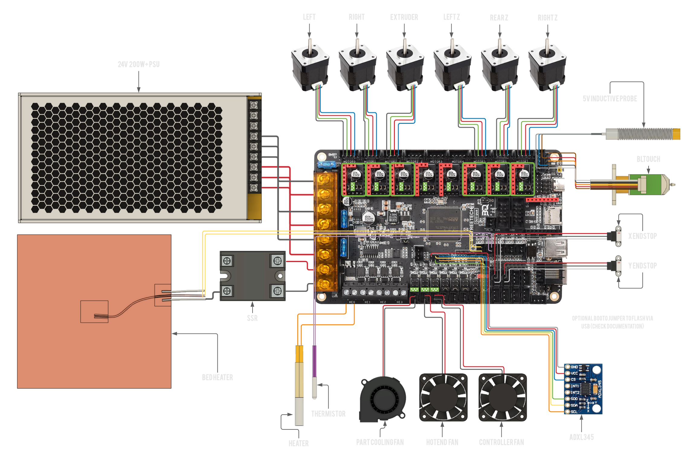En nuestro caso usamos como ya hemos comentado la excelente SKR Octopus, junto con unos TMC2209 en modo UART y optamos por usar sensorless para simplificar el cableado y dejar nuestra impresora lo más limpia de cables. Por otro lado usamos los excelentes motores de Stepper Online junto con el hotend Dragon de Triangelabs y el extrusor Orbiter además de un sensor IR de nivelación y una cama de silicona de 750W AC.