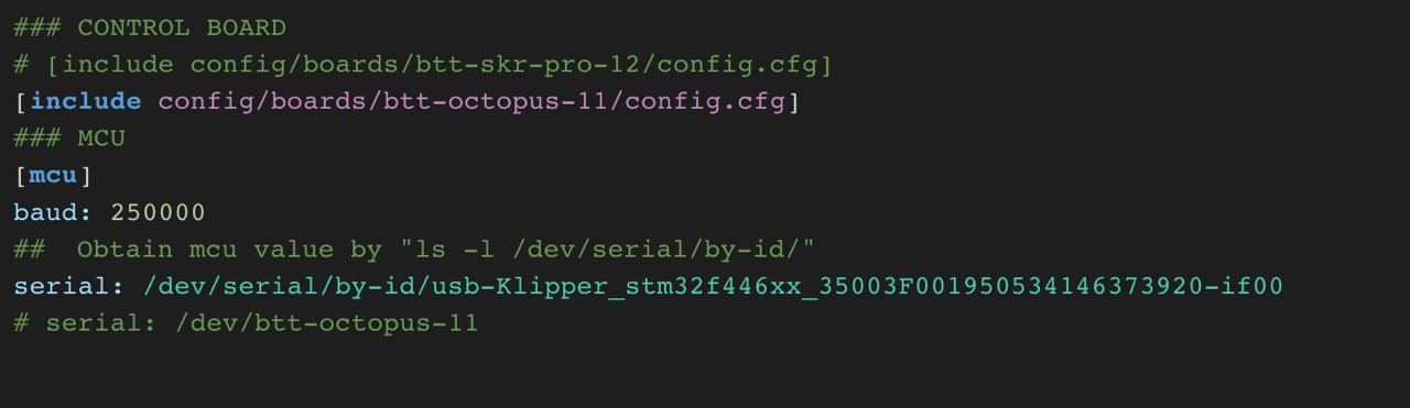 Es aconsejable hacerlo de este modo ya que Klipper carga de forma secuencial la configuración y en el caso de ponerlo antes del cfg de nuestra controladora se verá sobreescrito porque en el cfg de RatOS incluyen ya una definición de serial que puede que para nuestro caso no sea la correcta.