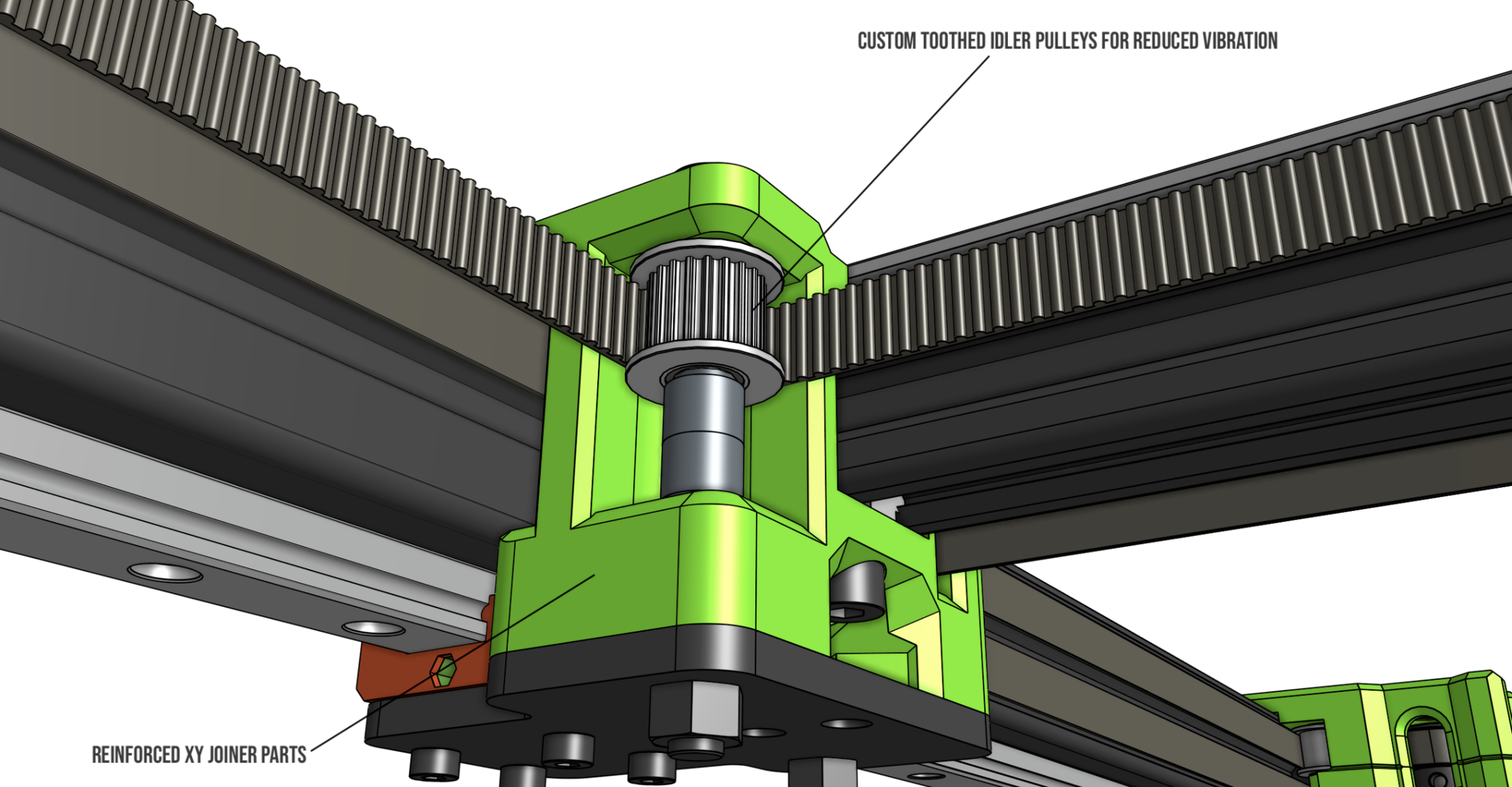 Cinemática CoreXY con correas de 9mm que le dan una robustez increíble a este tipo de máquinas además que aquí de nuevo Ratrig hicieron un trabajo excepcional en la colocación de las mismas y el diseño de las piezas de soporte.