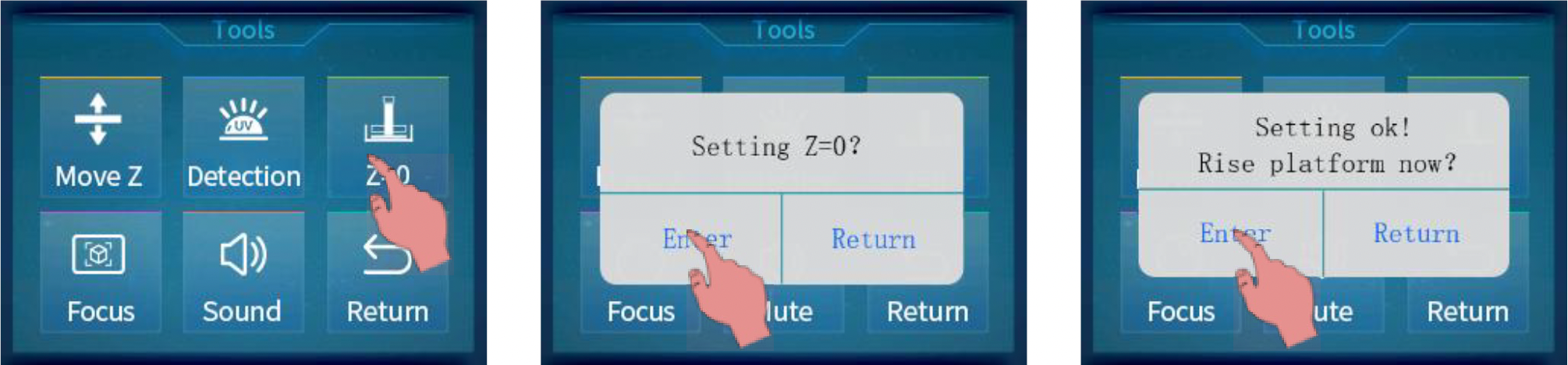 Volviendo a la pantalla iremos al menú Tools y pulsaremos sobre Z=0 para almacenar la posición 0 de nuestra impresora, pulsaremos Enter dos veces para aceptar Z=0 y levantar la plataforma de impresión para que nos permita retirar la hoja de nivelación
