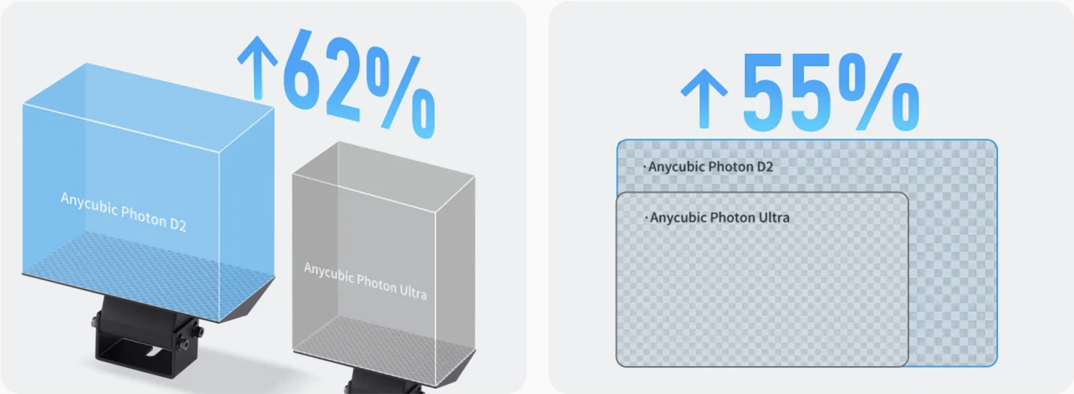 Comparada con su hermana Anycubic Photon Ultra la Photon D2 mejora el volumen de impresión, algo muy criticado en la Photon Ultra ya que limitaba bastante el número de proyectos que se podían realizar, que aumenta en un 62% llegando a los 1,58 L. Además también mejora el área XY de impresión incrementando esta en un 55% hasta los 95,32cm2.