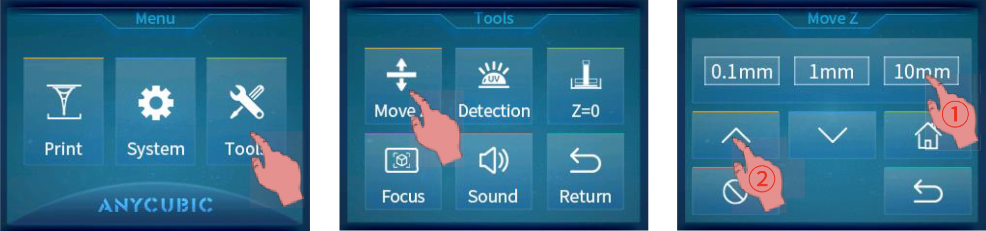 Pondremos en marcha la máquina con el interruptor de la parte trasera y acto seguido usando la pantalla dentro de Tools/Move moveremos el ene Z hacia arriba para dejar el hueco para instalar la plataforma de impresión