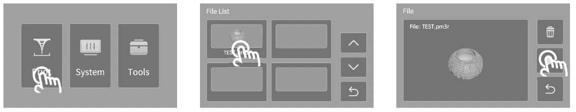 Colocaremos la hoja de nivelación (1) incluida pulsando a continuación en el icono Home (2), esperaremos a que el eje Z descienda y se pare automáticamente. Usando nuestros dedos presionaremos ligeramente sobre la plataforma de impresión para que esta presione la hoja de nivelación de forma uniforme apretando los tornillos de fijación de la plataforma de impresión (3).