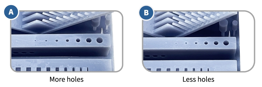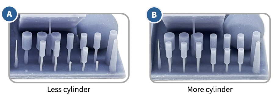 test pilares, esta prueba ayuda a determinar si los ajustes de la resina son adecuados para desarrollar la resistencia a la tracción y la adhesión de la capa. La subexposición de su impresión dará como resultado martillos defectuosos o deformados debido al aumento de la fuerza de tracción del FEP combinado con resina polimerizada.