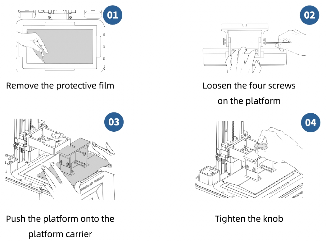 Procederemos a continuación quitando el protector de seguridad de la pantalla y su protector (1), cogeremos la plataforma de impresión y aflojaremos los tornillos del anclaje vertical para que quede libre (2) y de esta foma lo colocaremos y anclaremos en el brazo del eje Z (3 4).