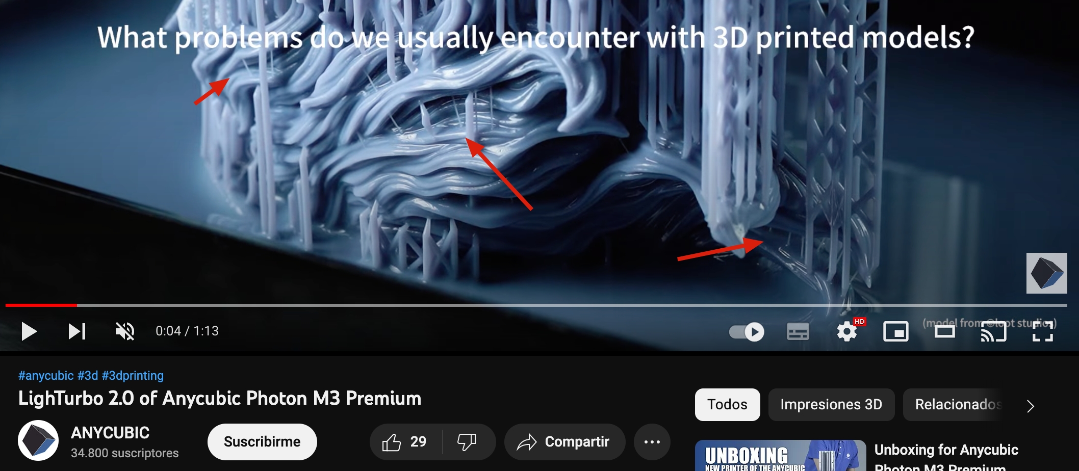 En todo caso algo que nos ha preocupado mas ha sido ver artefactos aleatorios a modo de micro soportes que suponemos que esta relacionado con el laminador Anycubic Workshop, nos tranquilizo un poco ver que incluso en los videos promocionales de Anycubic tambien aparecen. Una razon mas para que los fabricantes coordinen el lanzamiento de maquinas con el soporte de laminadores como Lychee/Chitubox.