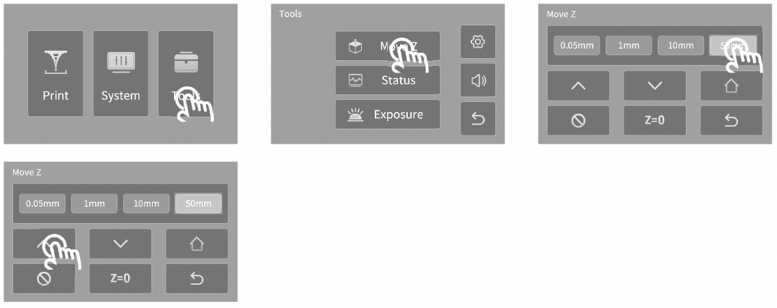 Pondremos en marcha la máquina con el interruptor de encendido de la parte lateral derecha, retiraremos el VAT aflojando los tornillos en sus laterales y acto seguido usando la pantalla dentro de Tools/Move moveremos el ene Z hacia arriba para dejar el hueco para instalar la plataforma de impresión
