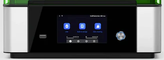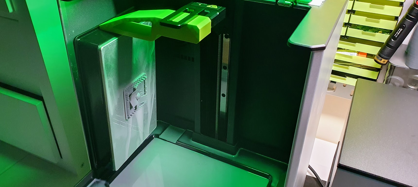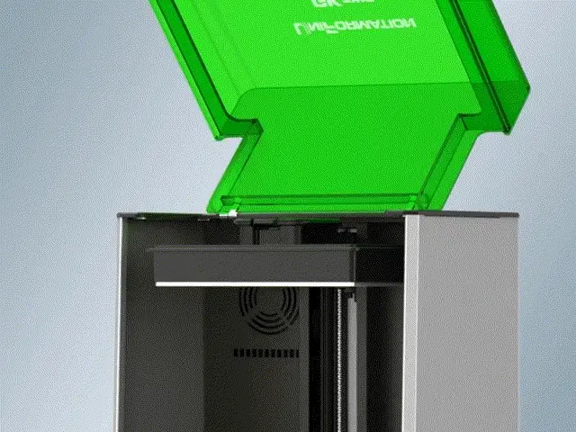 Por otro lado contamos con una puerta abatible en color verde que además de ser resistente al paso de luz UV para la protección de la resina, permite un acceso cómodo a la impresora.