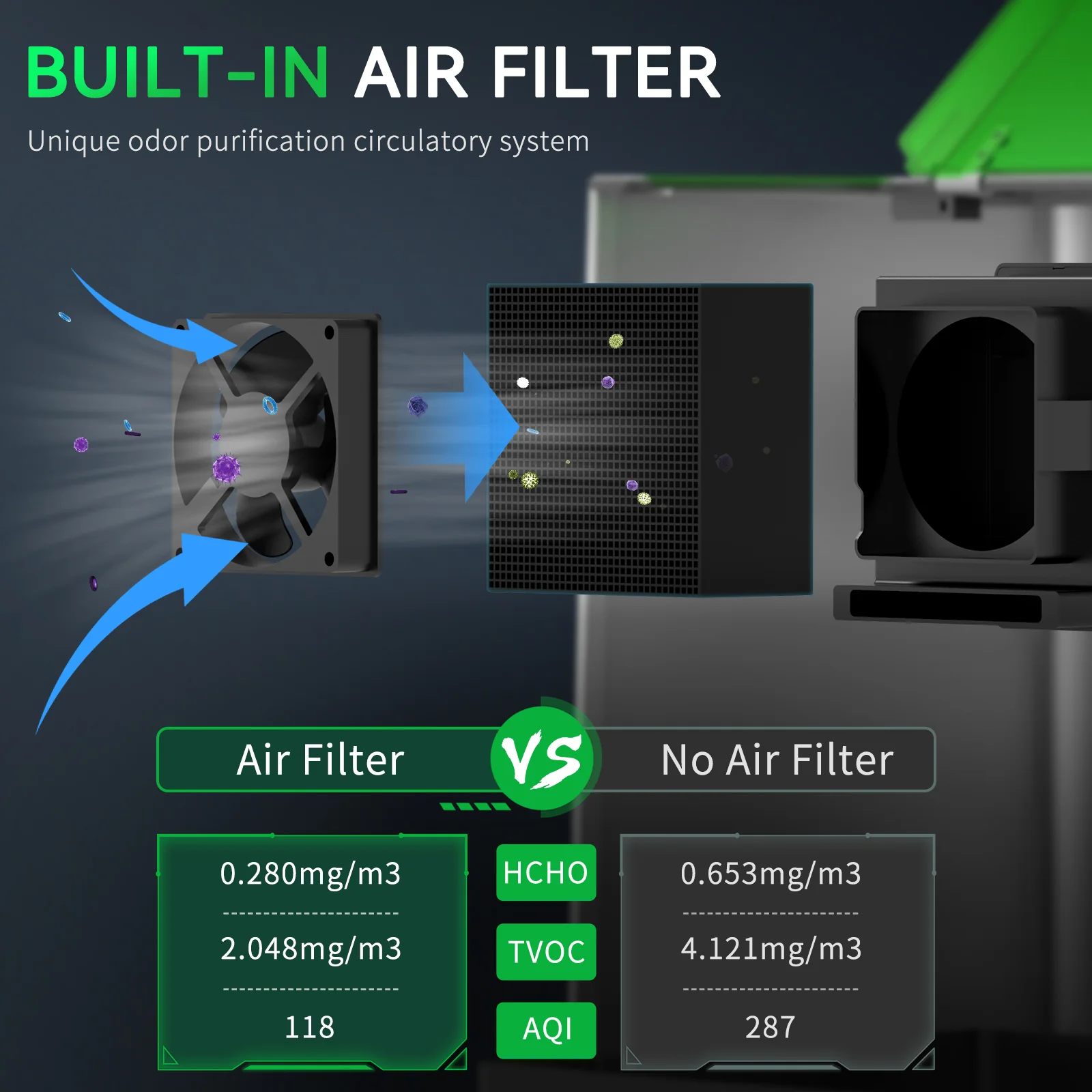 También disponemos de un sistema de filtrado de aire basado en carbono, que nos va a permitir reducir considerablemente el olor de la resina al igual que el filtrado de partículas nocivas como HCHO/TVOC/AQI. De nuevo y relacionado con la usabilidad de la impresora el cartucho es fácilmente reemplazable desde la parte exterior de la impresora.