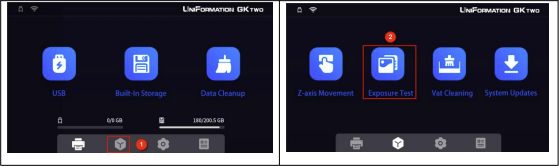 Conectaremos nuestra GKtwo a la corriente y la encenderemos, el primer paso será verificar que la pantalla funciona correctamente, para ello iremos al icono de función y pulsaremos sobre Exposure Test.